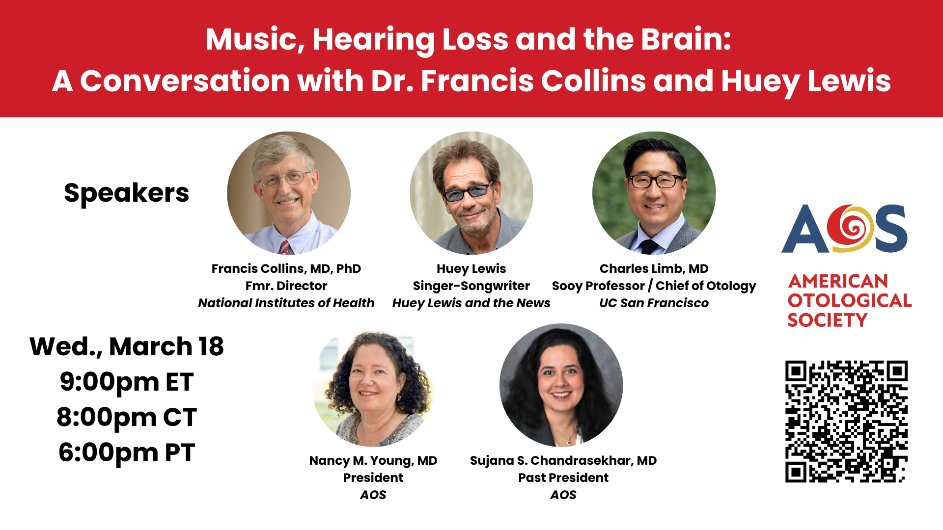 Music is one of the most naturally robust stimulants for the brain! Please join us for an exciting upcoming webinar featuring the esteemed Dr Francis Collins (former Director, NIH), musician Huey Lewis, and neurotologist Dr. Charles Limb. This unique panel of participants will cover a range of topics centered around music, hearing loss and medicine.