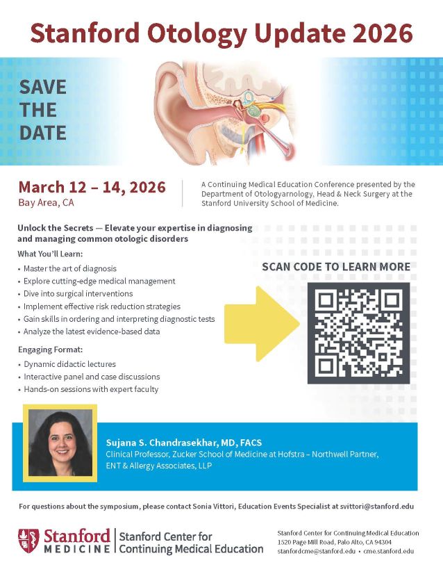 Name of meeting: Stanford Otology Update Date: March 12-14, 2026 Location: Stanford University School of Medicine CLICK IMAGE to access details of the Conference.